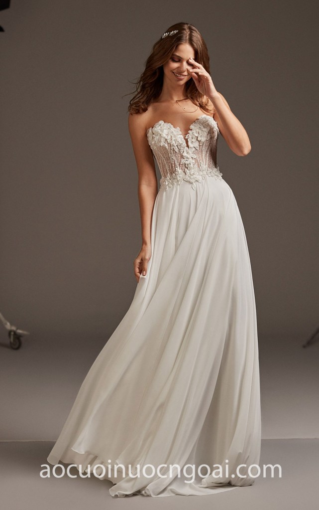 ÁO CƯỚI DẠ TIỆC CÚP NGỰC ĐÍNH HOA NỔI 3D NN7259