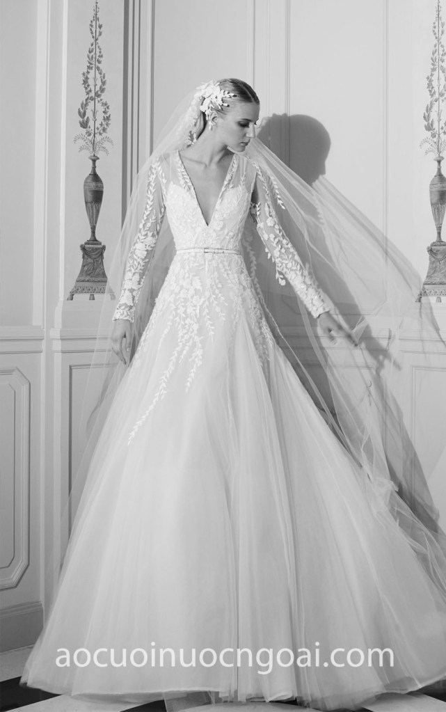 ÁO CƯỚI TAY DÀI ĐÍNH HOẠ TIẾT REN SANG TRỌNG NN7345