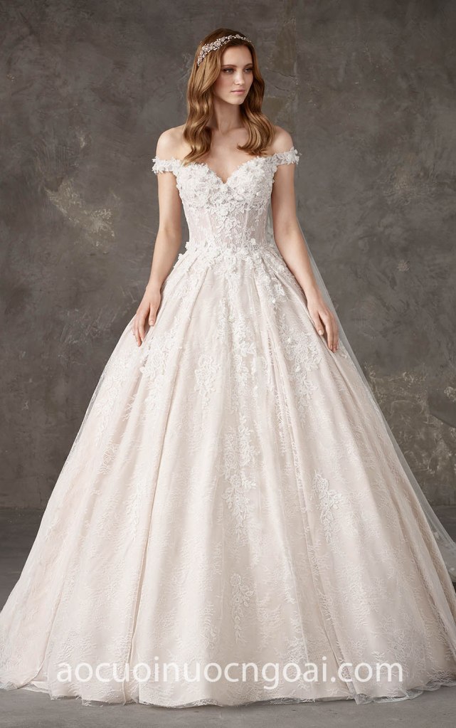 ÁO CƯỚI CÔNG CHÚA TRỄ VAI PHỐI REN XOÈ LỘNG LẪY NN7425