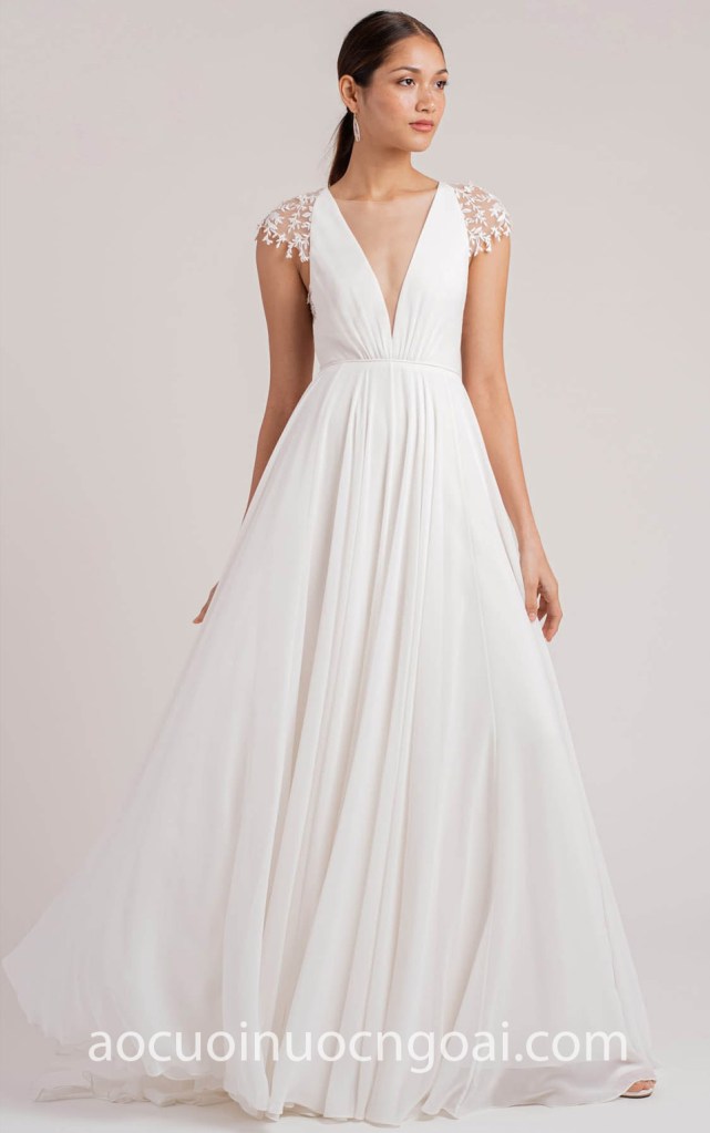 ÁO CƯỚI SUÔN NHẸ VAI ĐÍNH REN HOA NHÍ NN7454