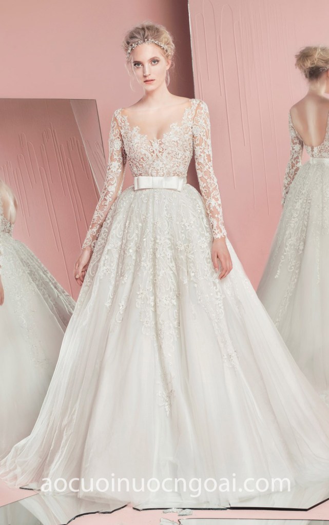 ÁO CƯỚI CÔNG CHÚA TAY DÀI PHỐI REN ĐÍNH NƠ XINH NN7470