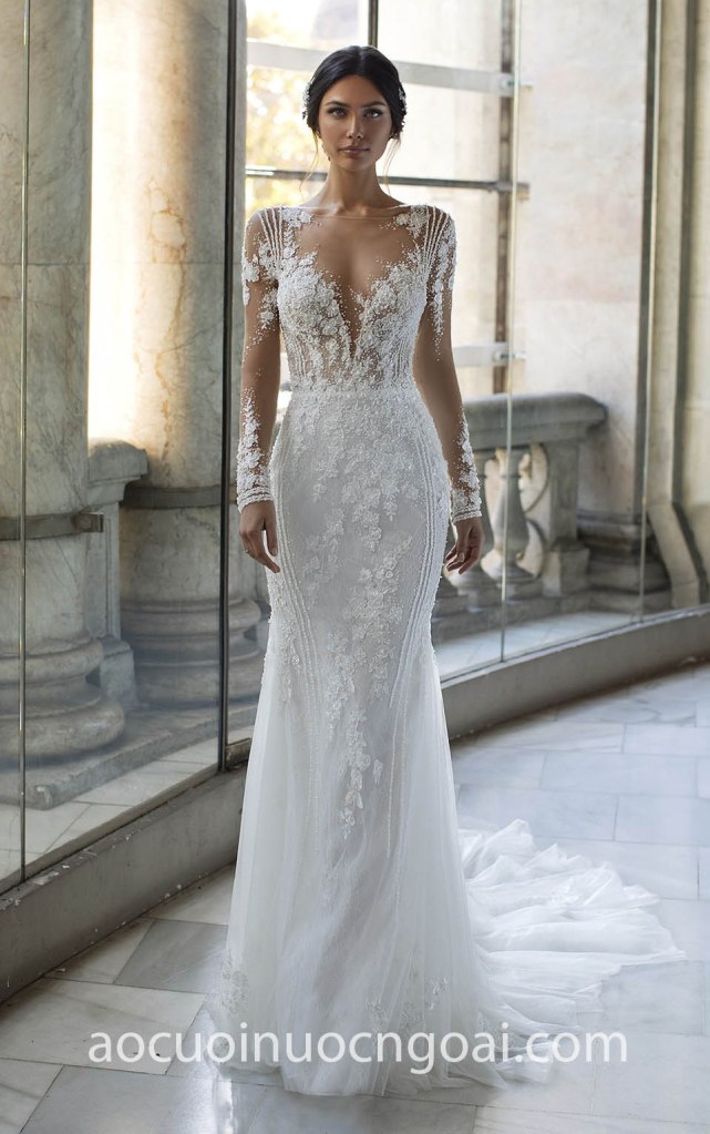 ÁO CƯỚI ĐUÔI CÁ TAY DÀI ĐÍNH KẾT CẦU KÌ NN7489