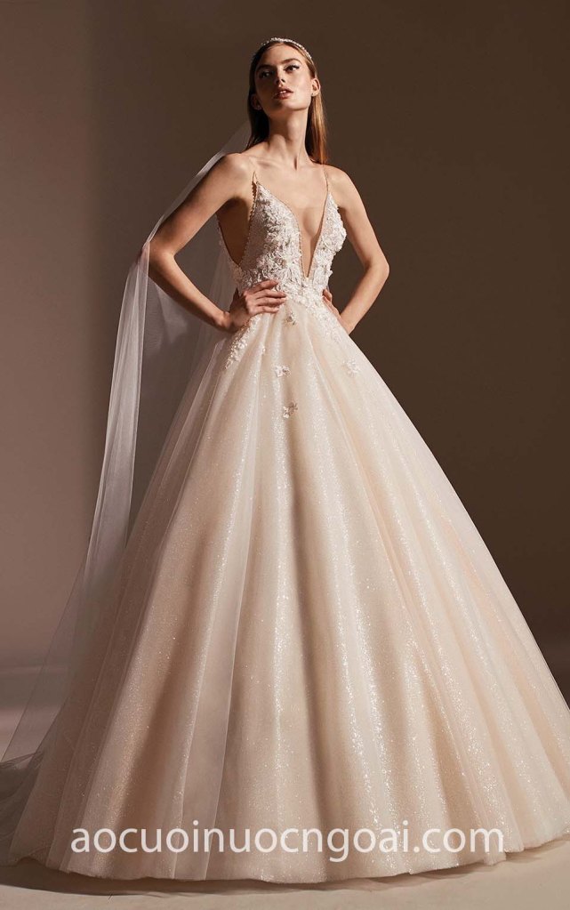 ÁO CƯỚI CÔNG CHÚA KIM SA 2 DÂY XẺ NGỰC SÂU SEXY NN7524