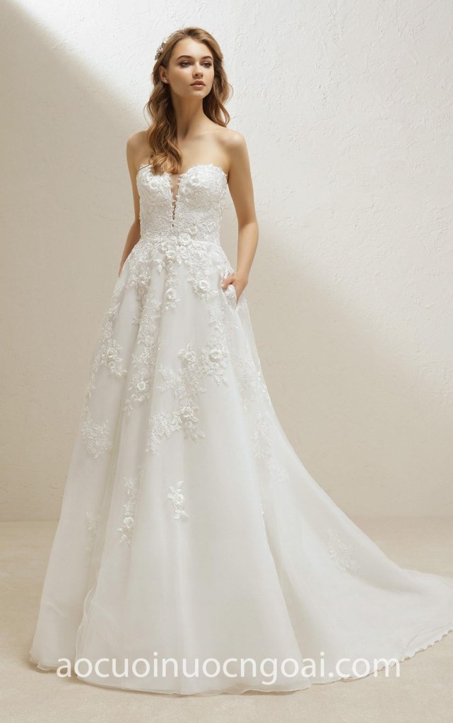 ÁO CƯỚI CÚP NGỰC REN THÊU HOA NN7544