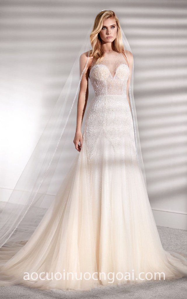 ÁO CƯỚI DẠ TIỆC CỔ YẾM ĐÍNH HẠT LẤP LÁNH NN7675