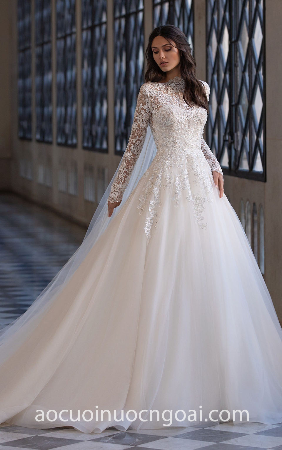 ÁO CƯỚI CHỮ A REN TAY DÀI CỔ CAO KÍN ĐÁO NN7688