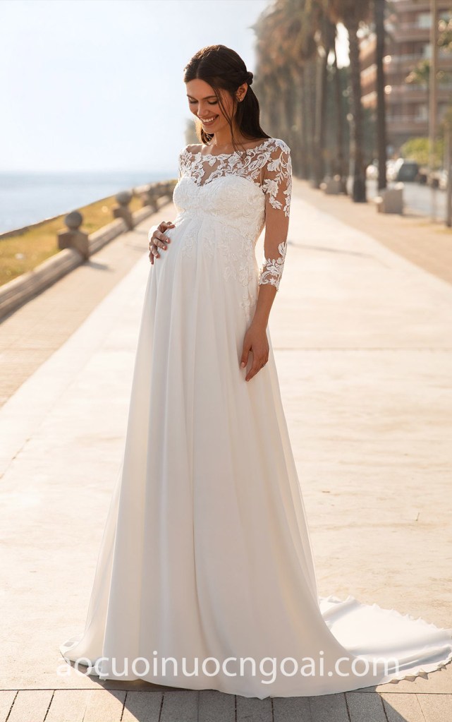 ÁO CƯỚI CHO CÔ DÂU MẸ BẦU TÙNG LỤA NHẸ TAY ÁO REN NN7704