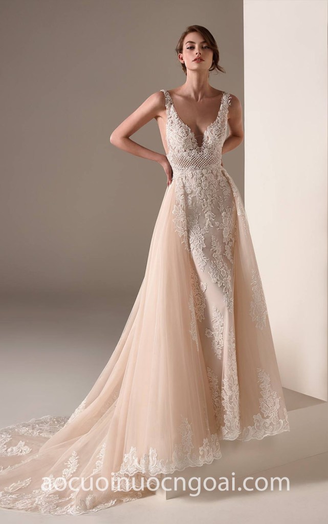 ÁO CƯỚI ĐUÔI CÁ LƯỚI 2 TRONG 1 MÀU DA PHỐI REN NỮ TÍNH NN7746