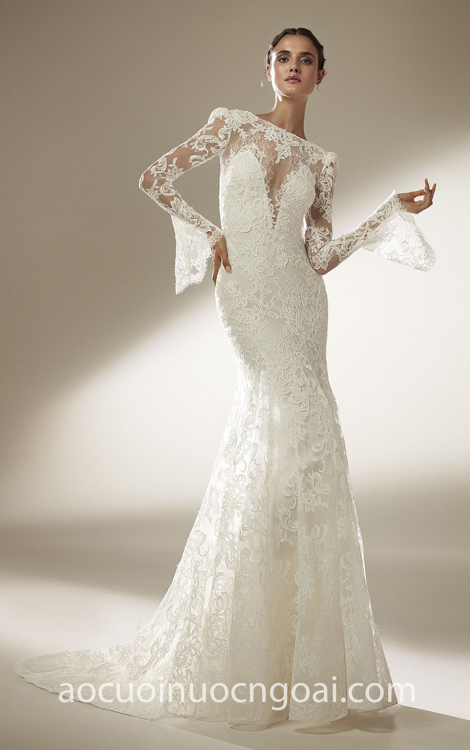 ÁO CƯỚI ĐUÔI CÁ REN TAY DÀI XẺ NGỰC SÂU GỢI CẢM NN7768