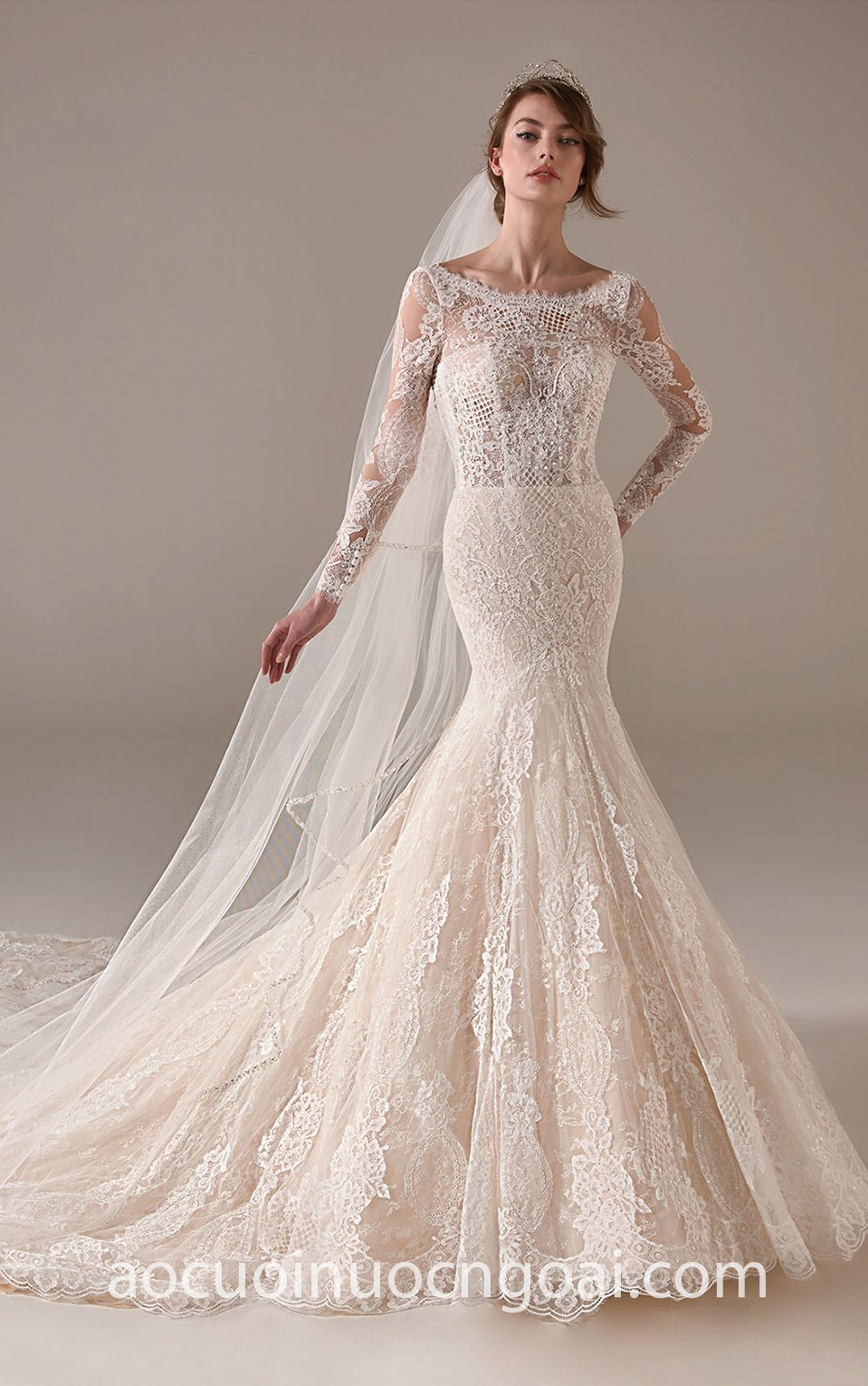 ÁO CƯỚI ĐUÔI CÁ REN TAY DÀI MÀU DA LỘNG LẪY NN7811