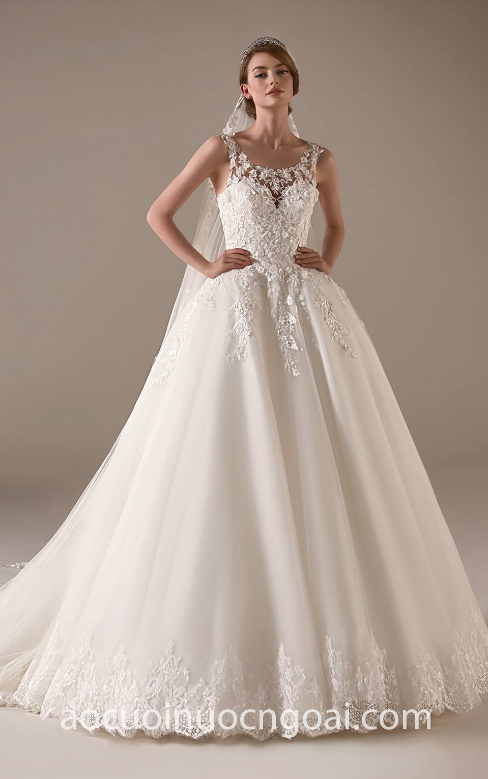 ÁO CƯỚI CÔNG CHÚA LƯỚI CỔ TRÒN VIỀN REN NN7825