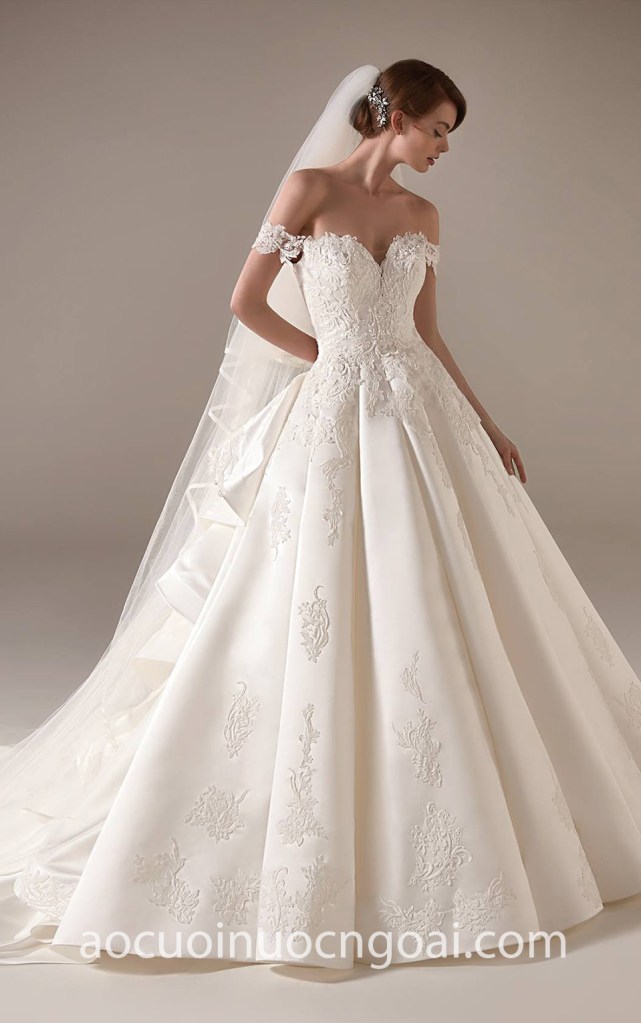ÁO CƯỚI CÔNG CHÚA SATIN TRỄ VAI REN ĐUÔI XẾP TẦNG NN7828