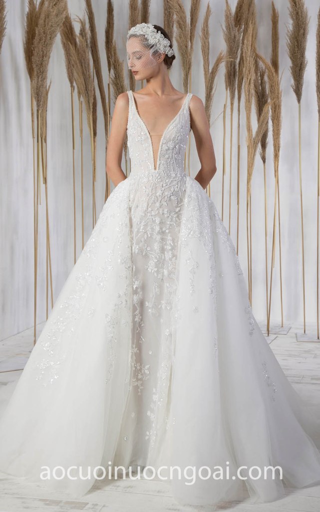 ÁO CƯỚI CÔNG CHÚA LƯỚI 2 TRONG 1 REN ĐÍNH KẾT LẤP LÁNH NN7905
