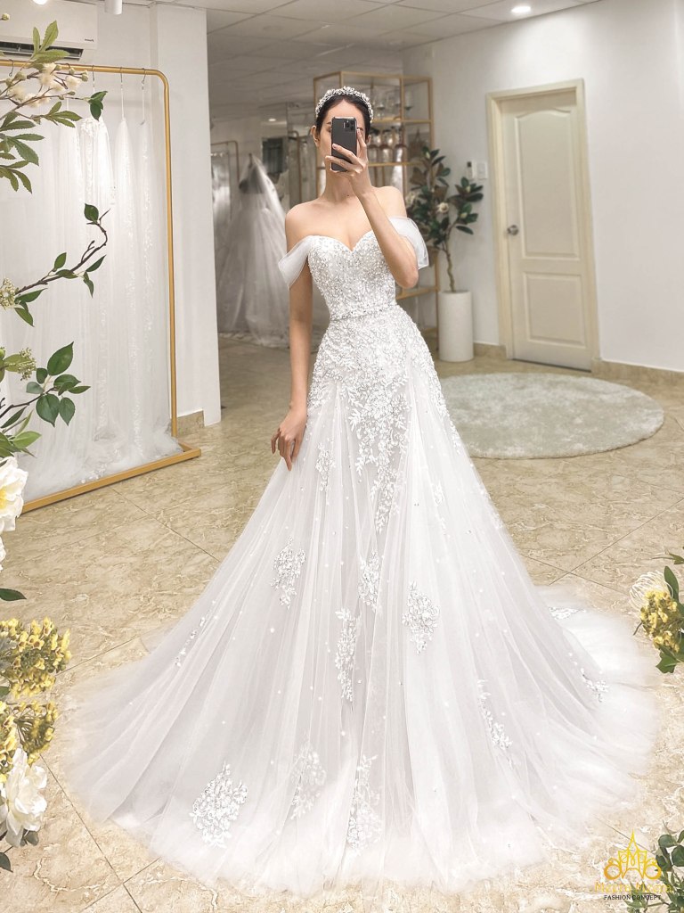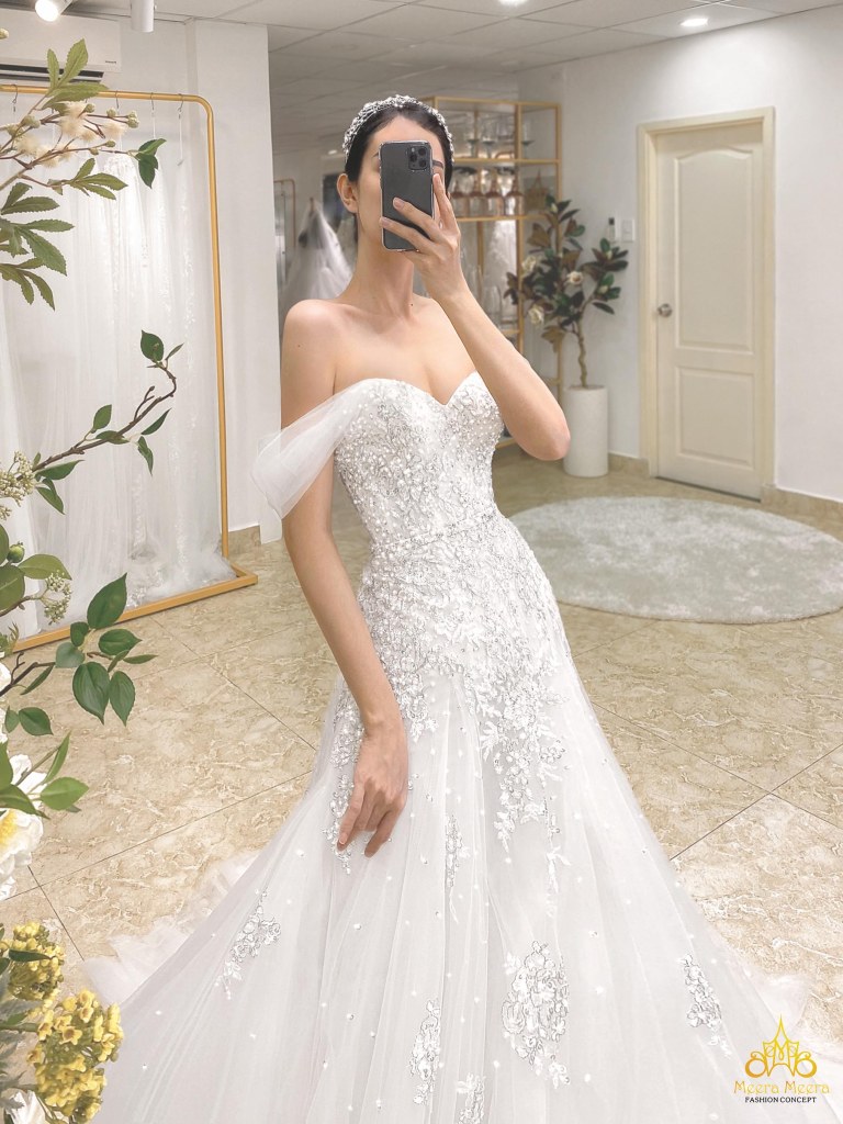 ÁO CƯỚI FIT AND FLARE TRỄ VAI PHỐI REN SANG TRỌNG. MÃ MM4069