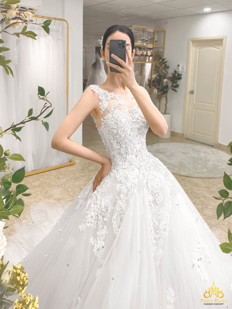 ÁO CƯỚI CÔNG CHÚA TÙNG LƯỚI XOÈ LỘNG LẪY ĐÍNH KẾT SANG TRỌNG. MÃ MM4098