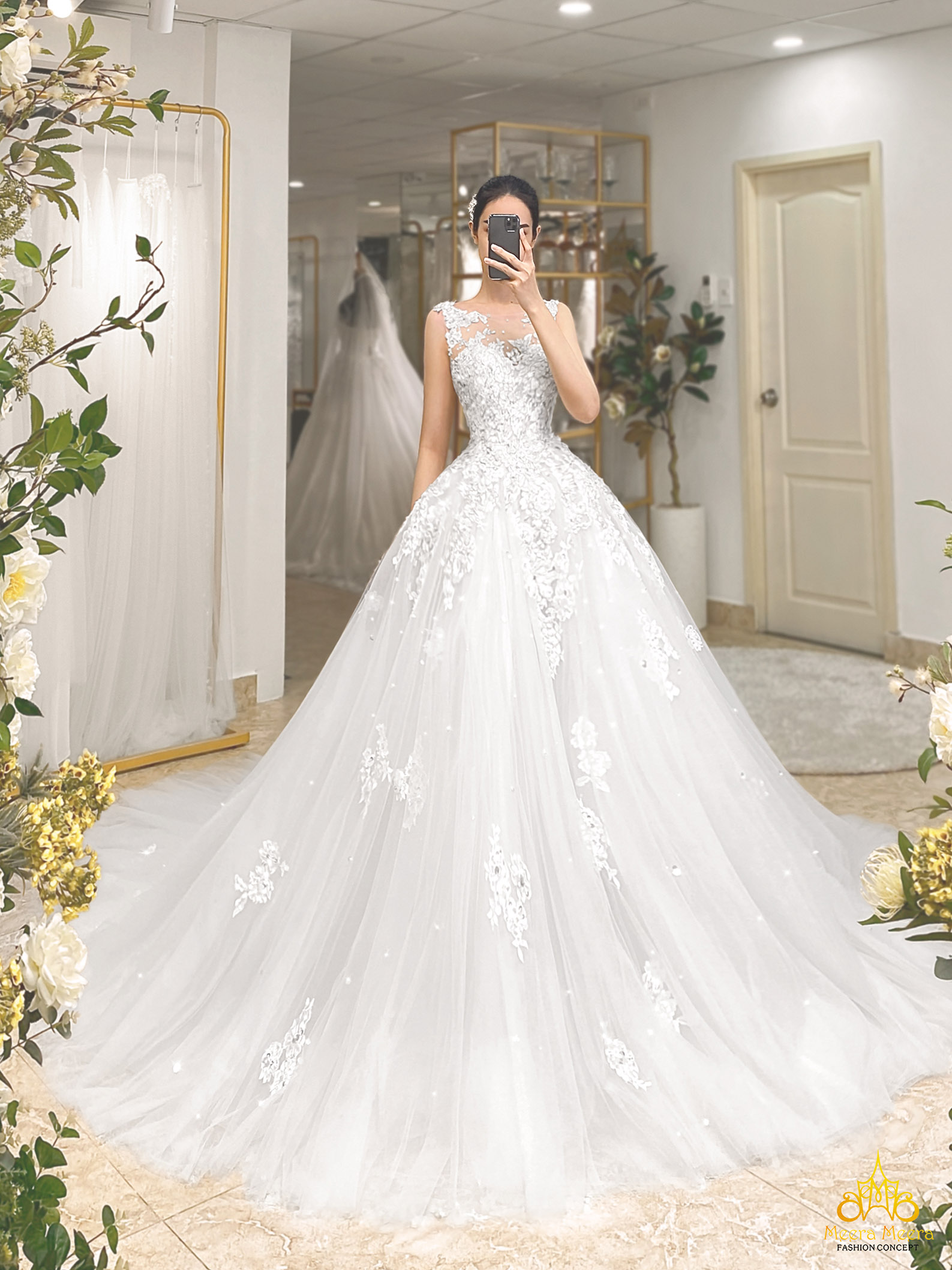 ÁO CƯỚI CÔNG CHÚA TÙNG LƯỚI XOÈ LỘNG LẪY ĐÍNH KẾT SANG TRỌNG. MÃ MM4098