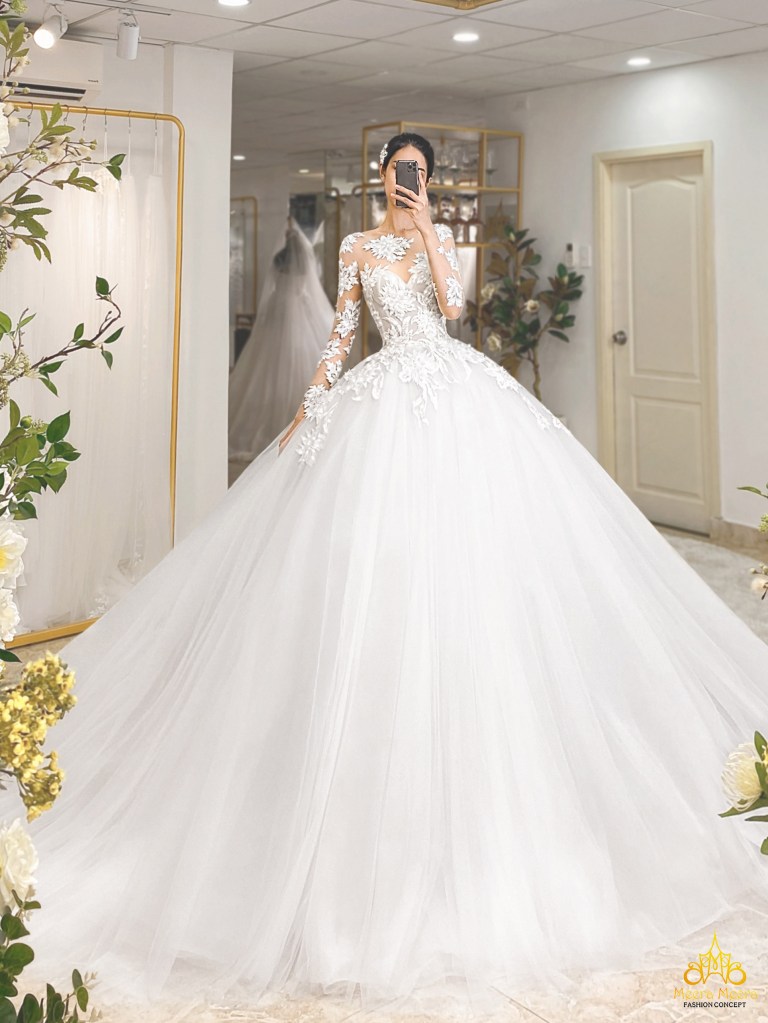 ÁO CƯỚI CÔNG CHÚA TAY DÀI XUYÊN THẤU TÙNG LƯỚI XOÈ PHỒNG LỘNG LẪY. MÃ MM4083