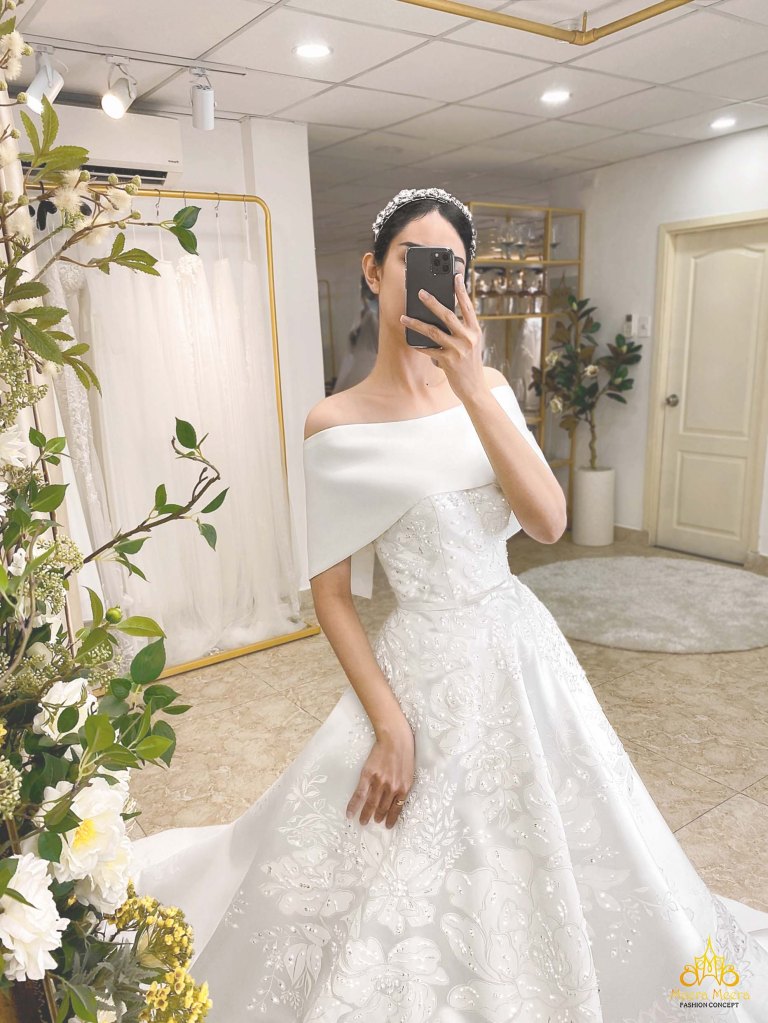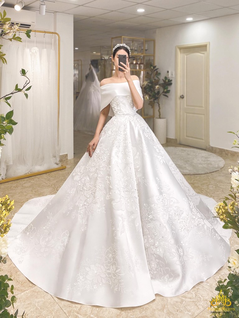 ÁO CƯỚI CÔNG CHÚA SATIN TRỄ VAI ĐÍNH KẾT HOẠ TIẾT ẤN TƯỢNG. MÃ MM4088
