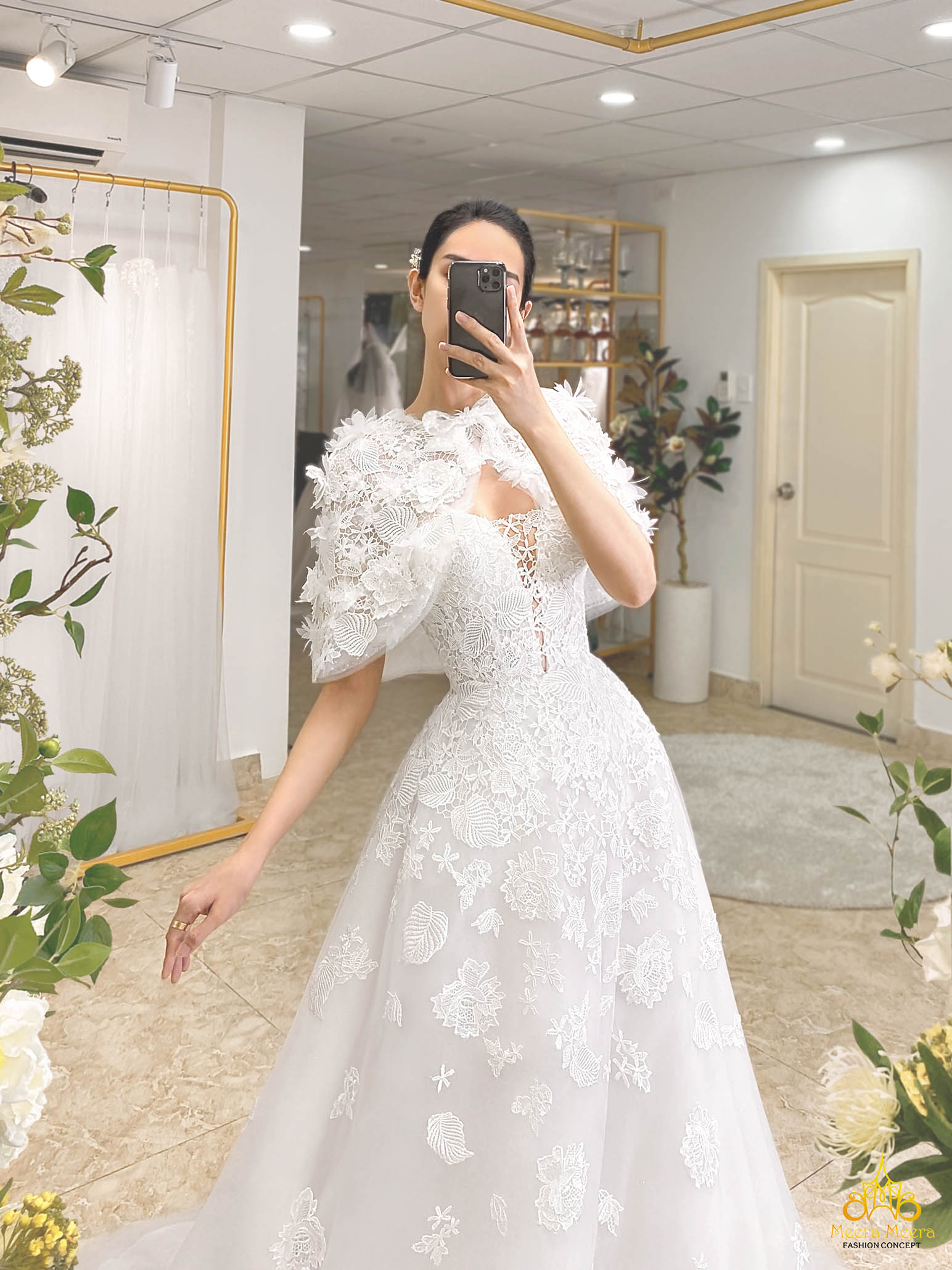 ÁO CƯỚI CHỮ A TÙNG LƯỚI KÈM ÁO KHOÁC CAPELET ĐÍNH HOA 3D NỔI BẬT. MÃ MM4107
