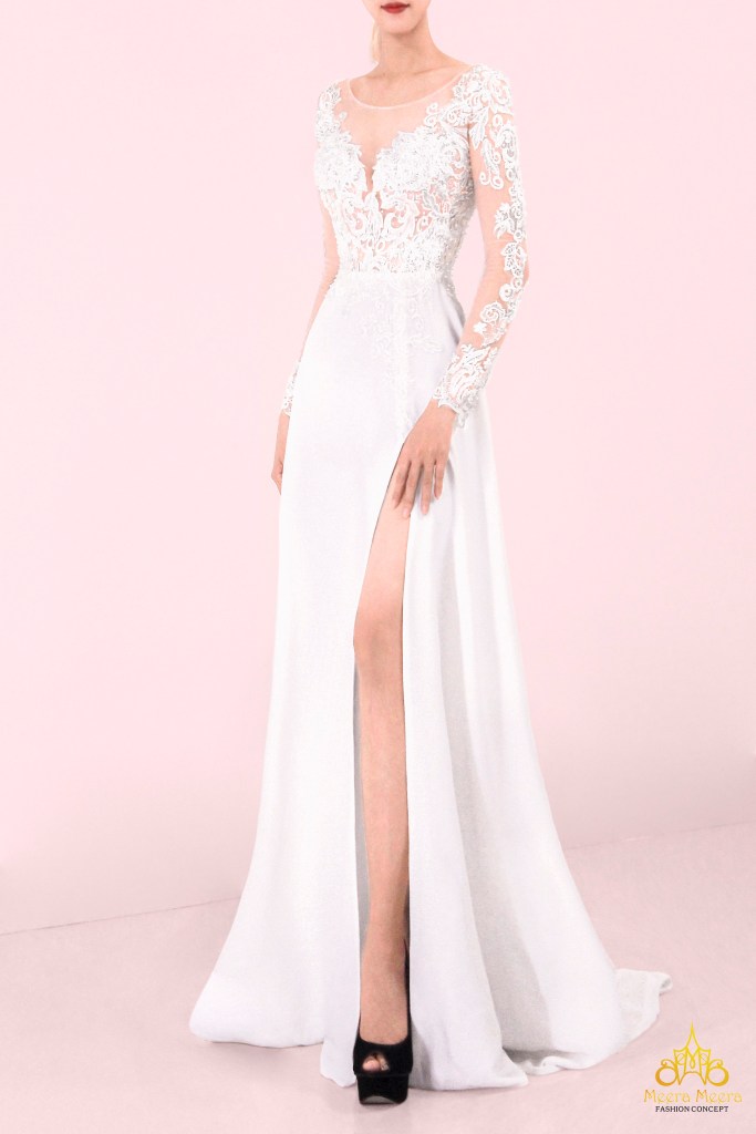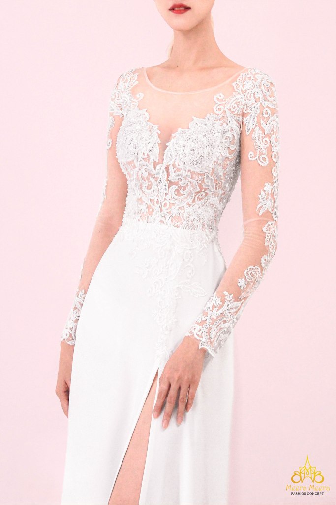 ÁO CƯỚI DẠ TIỆC LỤA XẺ TÀ CAO TAY DÀI XUYÊN THẤU PHỐI REN QUYẾN RŨ. MÃ KH3916