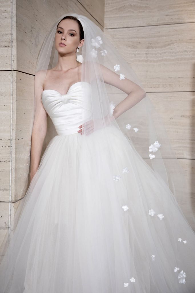 Nhà mốt lừng danh thế giới Elie Saab mang đến cho cô dâu mẫu thiết kế với dáng váy chữ A tùng xoè nhẹ nhàng, điểm nhấn ấn tượng là thân áo cúp ngực thắt nơ xinh xắn trên nền vải satin cao cấp. Cô dâu có thể phối thêm mạng che mạn với hoa nở lãng mạn bên trên.