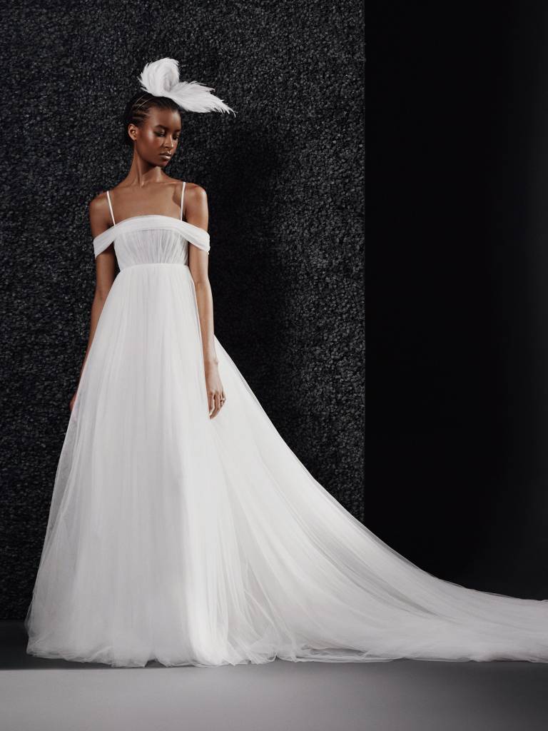 Cô dâu Vera Wang rất thường xuất hiện trong những chiếc váy cưới được dệt may từ lưới. Chiếc váy cưới dành cho năm 2022 hợp tác cùng Pronovias, mang đến cho cô dâu sự nữ tính quyến rũ với tay áo trễ vai 2 dây khoe khéo xương quai xanh. Thả dài bên dưới là chân váy lưới xoè dài thướt tha.