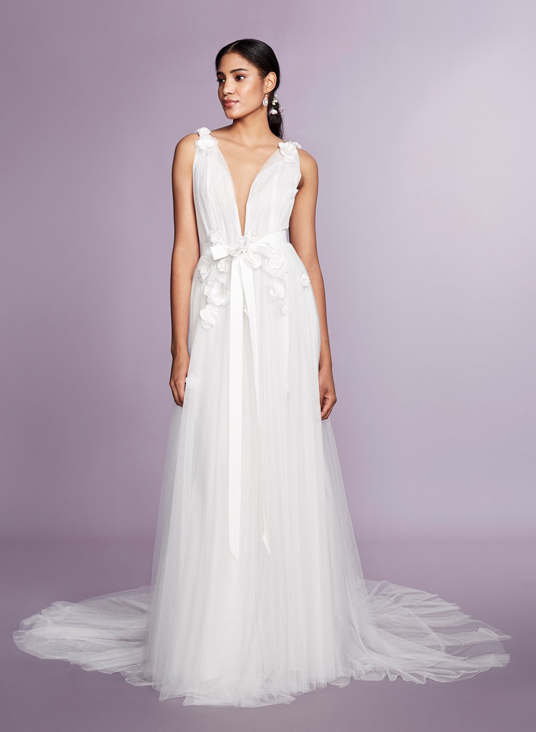 Marchesa nổi tiếng với hình tượng các nữ thần đã tặng cho cô dâu 2022 mẫu váy cưới chữ A xoè nhẹ trên nền vải lưới thanh cao, cổ V xẻ sâu quyến rũ với điểm nhấn là những bông hoa 3D nở xinh xắn phối cùng thắt lưng nơ điệu đà.