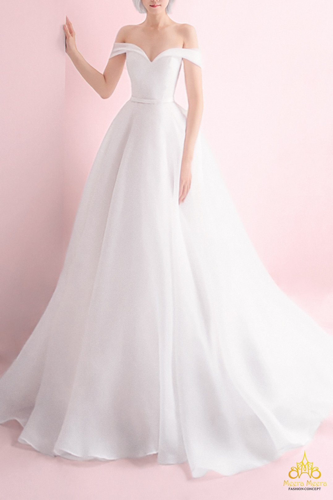 Là một cô dâu yêu thích phong cách tối giản minimalist, chắc chắn bạn sẽ không thể bỏ qua mẫu thiết kế này. Phom dáng váy cưới đơn giản với ngực xẻ cùng tay áo trễ vai sẽ làm cô dâu mập thêm cân đối, tùng váy voan nhẹ nhàng giúp che bụng và nâng bước cho bạn tiến vào lễ đường nhẹ tênh.
