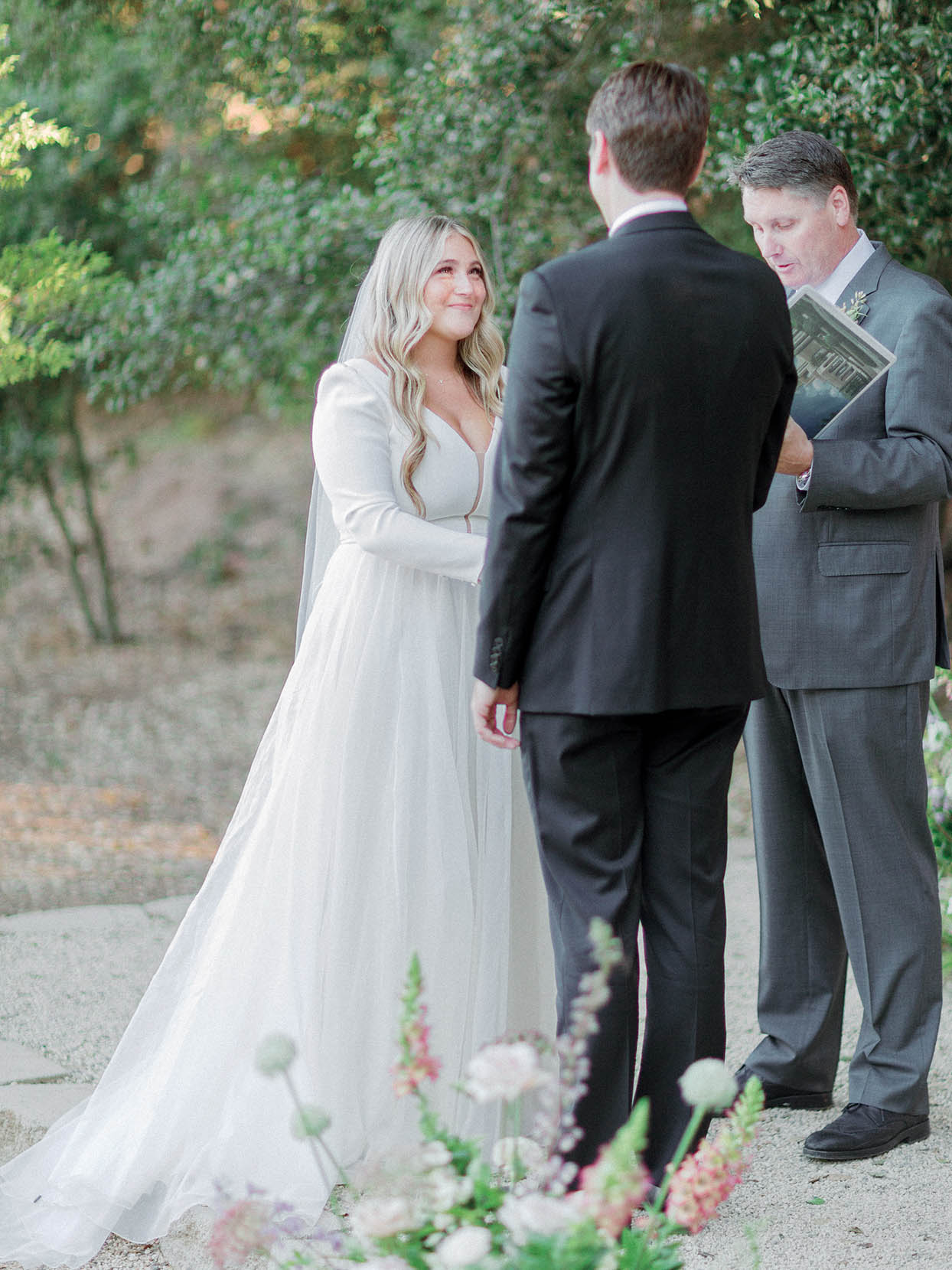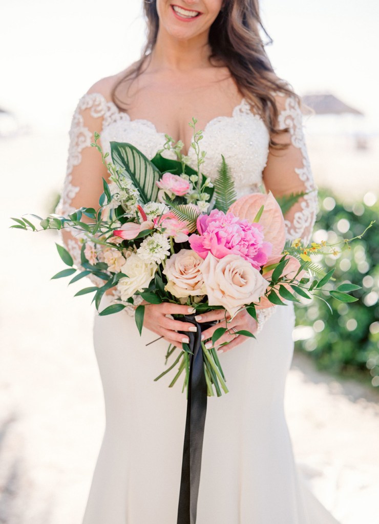 Khi lựa chọn mặc áo cưới tay dài, bạn lưu ý nên chọn cổ áo xẻ V cùng tay dài xuyên thấu để giúp cân đối thân trên nhé. Hoạ tiết ren với sự sắp đặt vừa phải sẽ làm bạn thêm nhẹ nhàng và nữ tính hơn.
