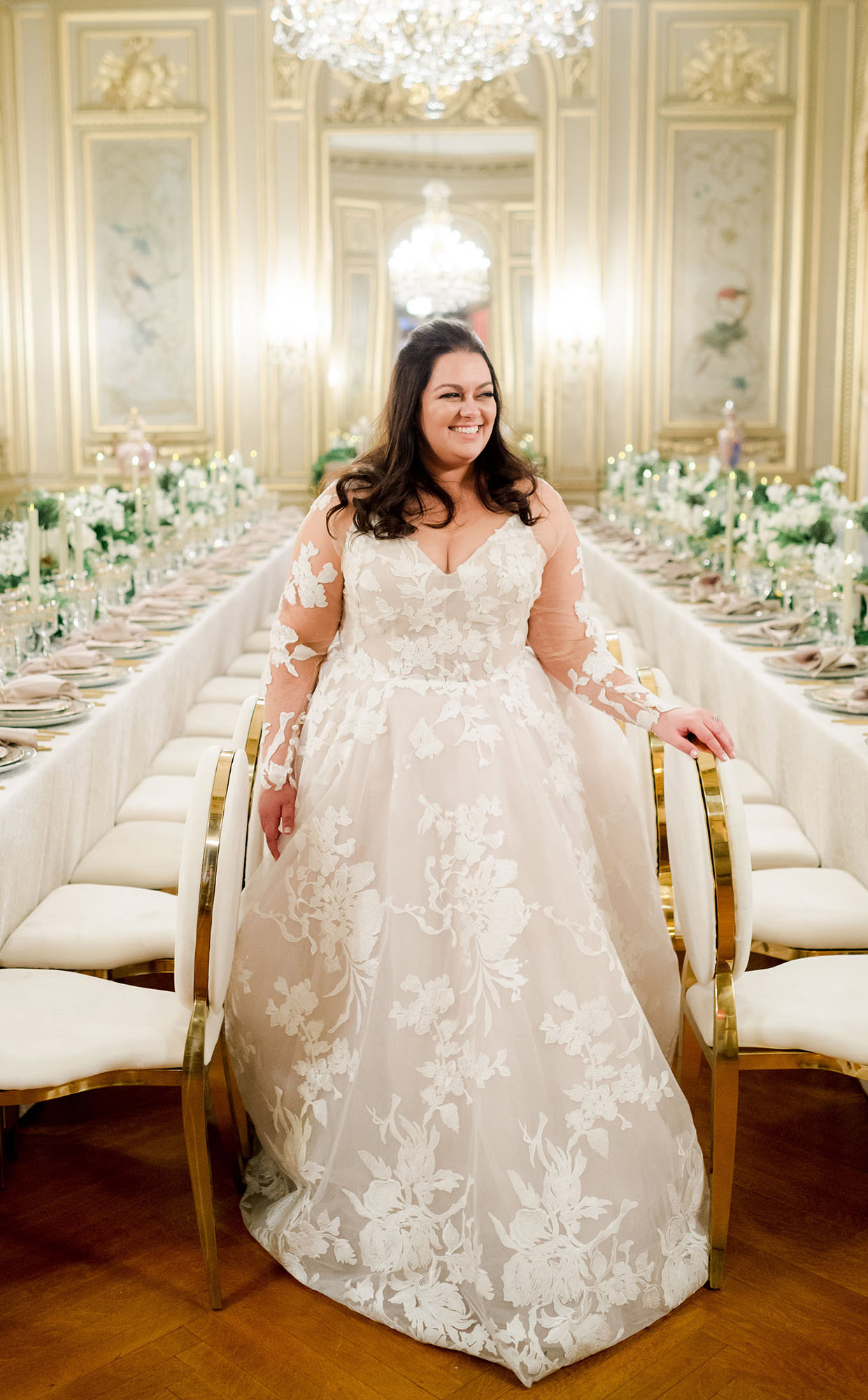 Áo cưới tay dài cùng tùng váy lụa cũng là một trong những lựa chọn rất được yêu thích của cô dâu bóng tròn. Chất liệu mềm mại cùng chi tiết đính kết vừa phải sẽ giúp cô dâu càng thêm quyến rũ.