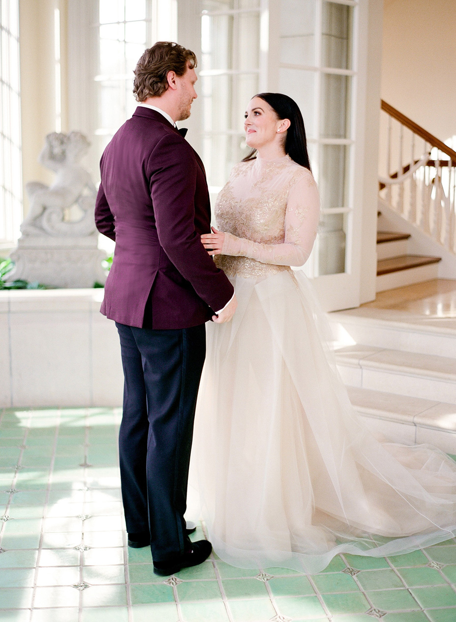 Nếu ngại mặc kiểu áo trễ vai, hãy chọn kiểu tay áo dài xuyên thấu có hiệu ứng trễ vai này. Đây là một gợi ý hoàn hảo cho cô dâu thích sự gợi cảm nhưng vẫn mang nét trang trọng.