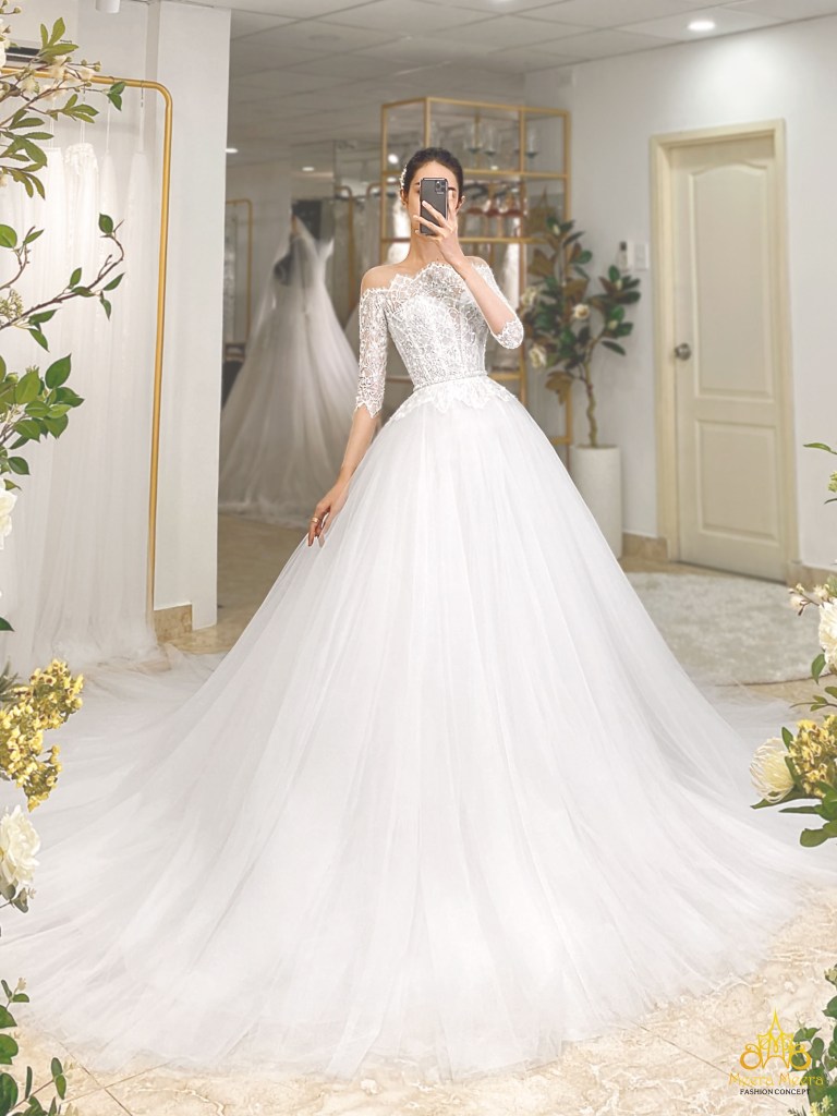 Cuối cùng, những chiếc áo cưới tay dài sẽ là lựa chọn tối ưu nếu bạn cảm thấy không thoải mái với những kiểu áo trên. Tay áo dún nhẹ sẽ giúp cho phần thân áo satin phía trên cân đối hơn, trong khi chân váy lưới sẽ khiến bạn trở nên nhẹ nhàng thanh thoát.