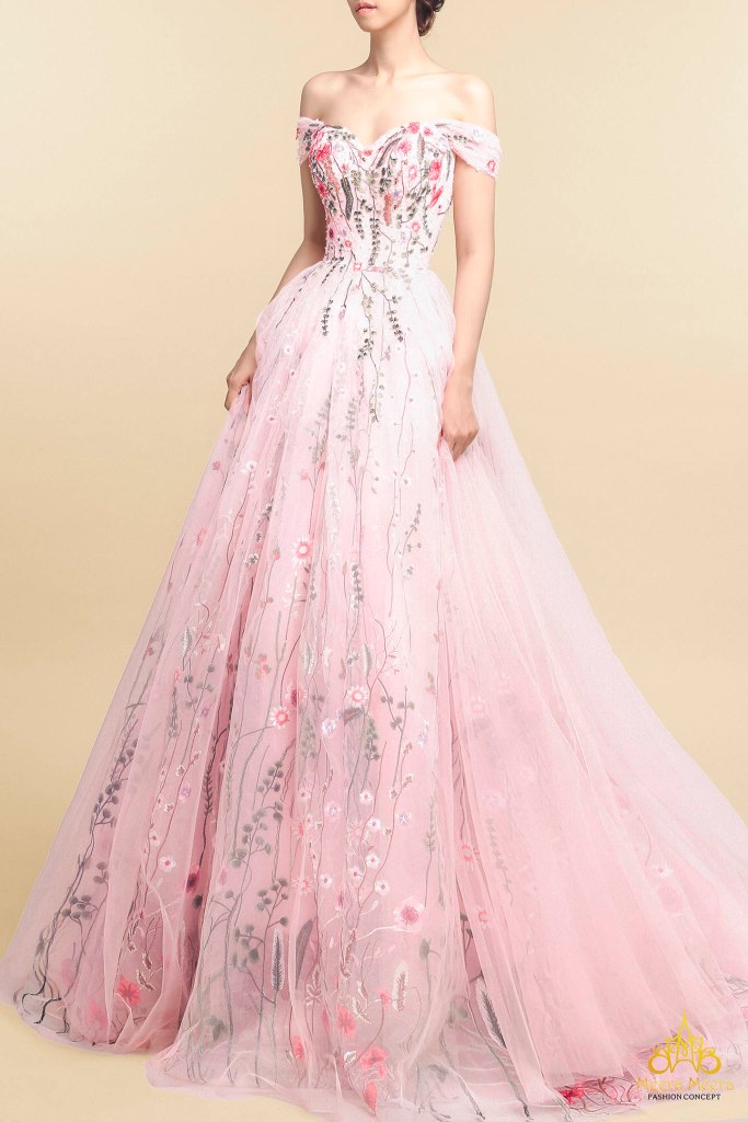 Cô dâu muốn được toả sáng trong đám cưới cổ tích sẽ không thể nào bỏ qua chiếc váy cưới công chúa màu hồng này! Mẫu thiết kế với phần thân áo trễ vai khoe trọn xương quai xanh, toàn bộ váy cưới được đính kết hoạ tiết hoa lá vô cùng sống động sẽ biến bạn trở thành nàng công chúa mùa xuân xinh đẹp nhất.