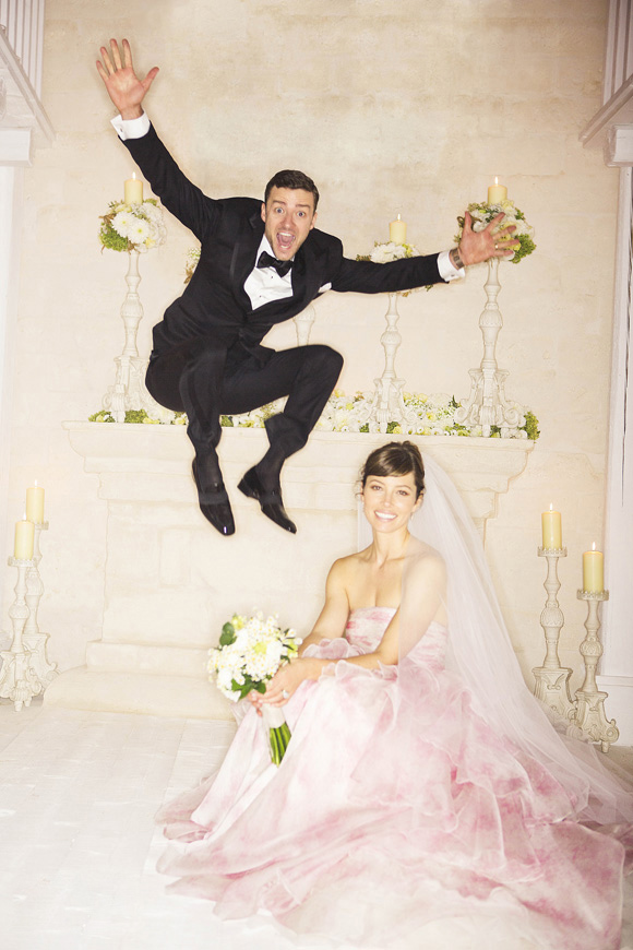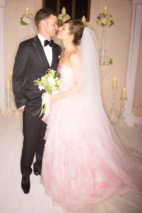 Nữ diễn viên nổi tiếng Jessica Biel đã từng lựa chọn cho mình một chiếc váy cưới màu hồng tuyệt đẹp dành cho đám cưới với nam ca sĩ Justin Timberlake. Được biết mẫu thiết kế đến từ thương hiệu cao cấp Giambattista Valli, nổi bật với gam màu hồng dâu ngọt ngào cùng những chi tiết xếp bèo tầng đầy lãng mạn.