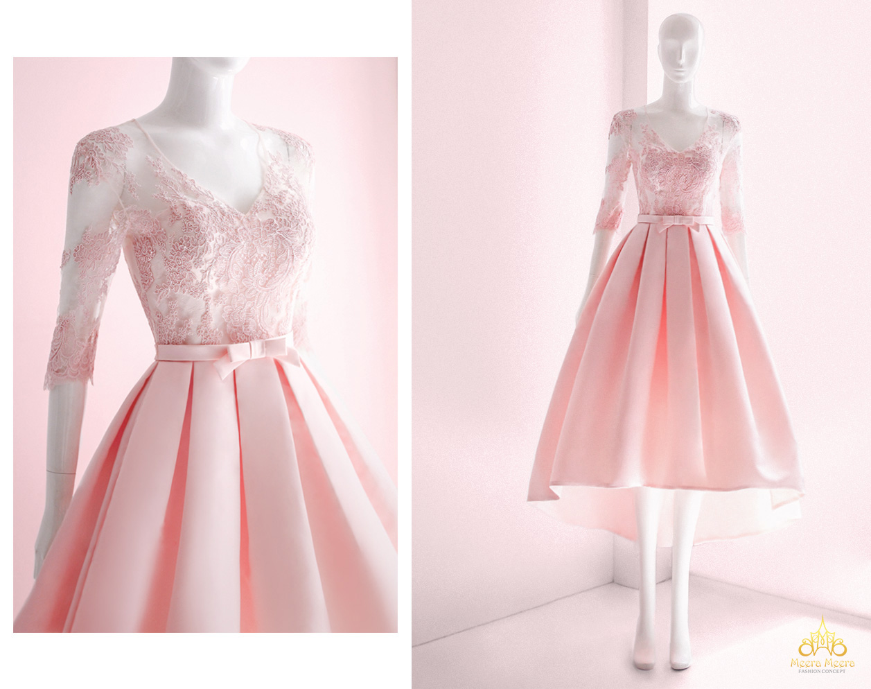 Nếu bạn muốn tìm kiếm một chiếc váy cưới vừa xinh xắn, lại có thể tái sử dụng được nhiều lần trong nhiều sự kiện thì đây là lựa chọn hoàn hảo cho bạn. Mẫu váy cưới midi dress kết hợp chất liệu satin màu hồng dâu dịu ngọt, phối cùng hoạ tiết ren nữ tính sẽ giúp bạn trở thành cô dâu xinh xắn nhất trong đêm tiệc.