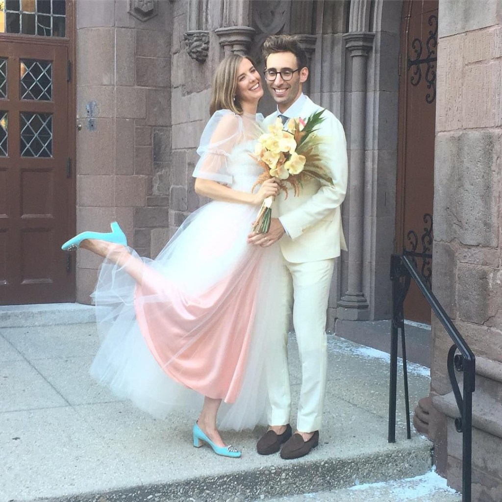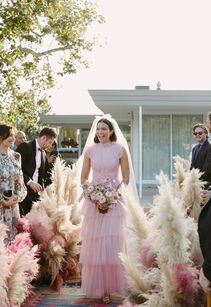 Nữ ca sĩ/ diễn viên Mandy Moore vô cùng xinh xắn với thiết kế váy cưới màu hồng phấn chấm bi được xếp tầng lãng mạn, đồng thời giúp cô dâu dễ dàng di chuyển bởi chân váy có độ xoè vừa phải. Được biết mẫu thiết kế đến từ thương hiệu nổi tiếng Rodarte.