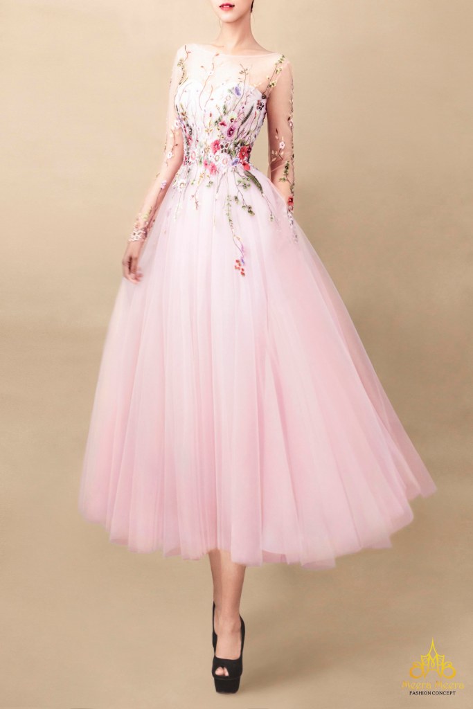 Thiết kế thanh lịch và bay bổng này sẽ rất phù hợp cho những cô dâu tổ chức đám cưới vào mùa xuân. Mẫu váy cưới midi dress xuất hiện tươi mới với hoạ tiết hoa lá nở rực rỡ ở thân trên, tay áo dài trang trọng phù hợp cho nhiều loại hình đám cưới và chân váy dài vừa đủ sẽ giúp bạn dễ dàng di chuyển cho mọi hoạt động.