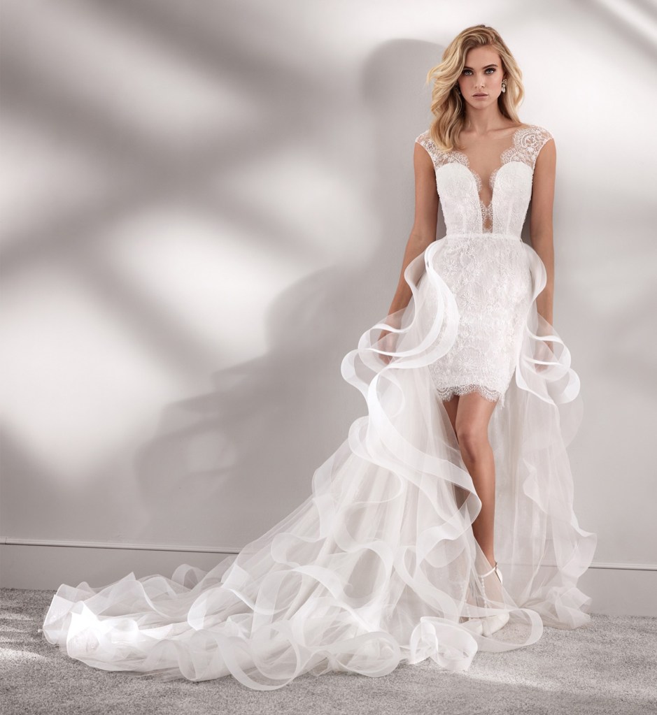 Dù bất kỳ loại hình đám cưới nào, áo cưới 2 trong 1 vẫn luôn là lựa chọn thông minh và tiện dụng mà mọi cô dâu đều ưa thích. Nicole Spose gửi đến các cô dâu mẫu thiết kế đậm chất dạ hội với thân áo cocktail thêu ren nổi bật cùng đường xẻ ngực táo bạo, điểm nhấn đặc sắc là chân váy rời xếp bèo gợn sóng đầy ấn tượng.