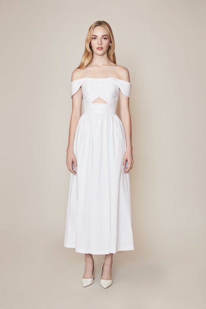 Những cô dâu ưa thích phong cách minimalist sẽ có thêm một lựa chọn tuyệt vời với mẫu váy cưới tea-length trễ vai từ nhà Lela Rose. Dáng váy suôn nhẹ càng thêm nữ tính với tay áo trễ vai khoe trọn xương quai xanh, chi tiết cut-out khéo léo ở giữa ngực và eo góp phần thu hút sự chú ý vào vẻ đẹp tinh khôi của cô dâu.