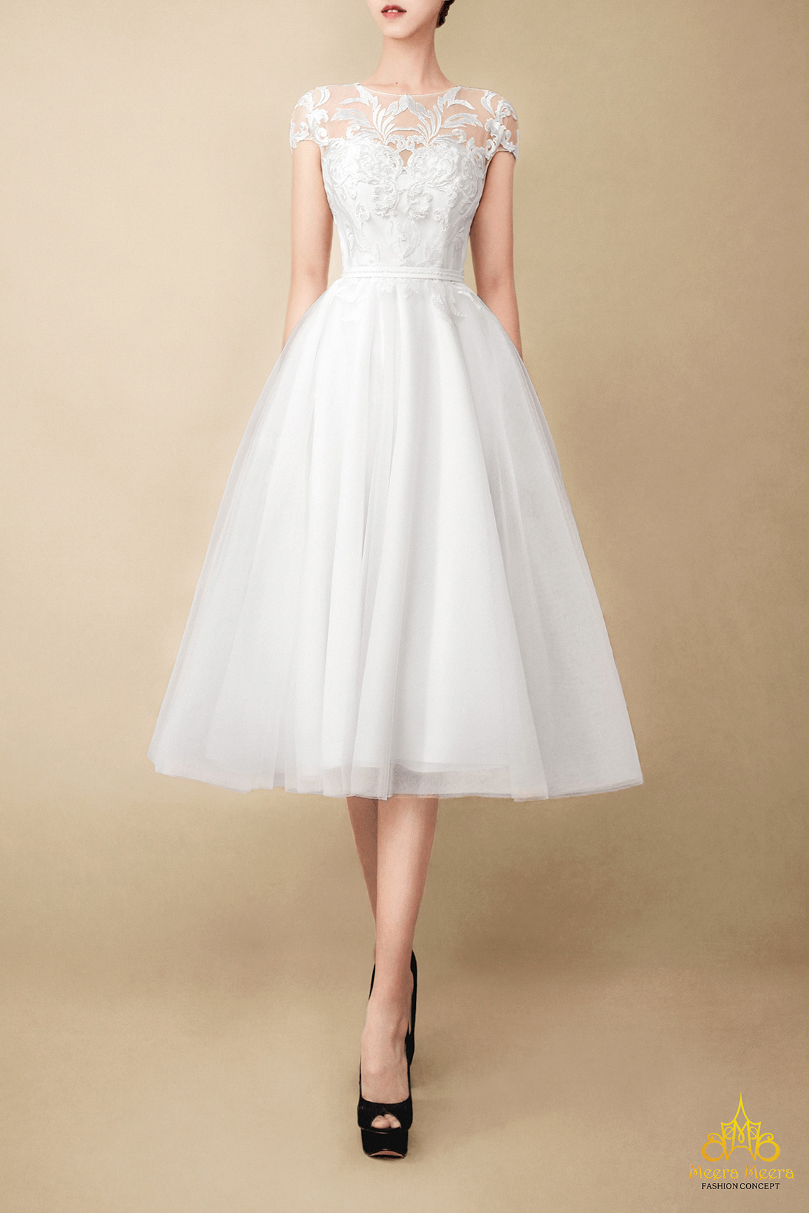 Thiết kế thanh lịch với chi tiết phối ren tinh tế của nhà Meera Meera là sự lựa chọn hoàn hảo cho cô dâu tổ chức đám cưới ở những địa điểm trang trọng, đồng thời vẫn giữ được sự năng động và linh hoạt với chân váy tea-length bềnh bồng bay bổng.