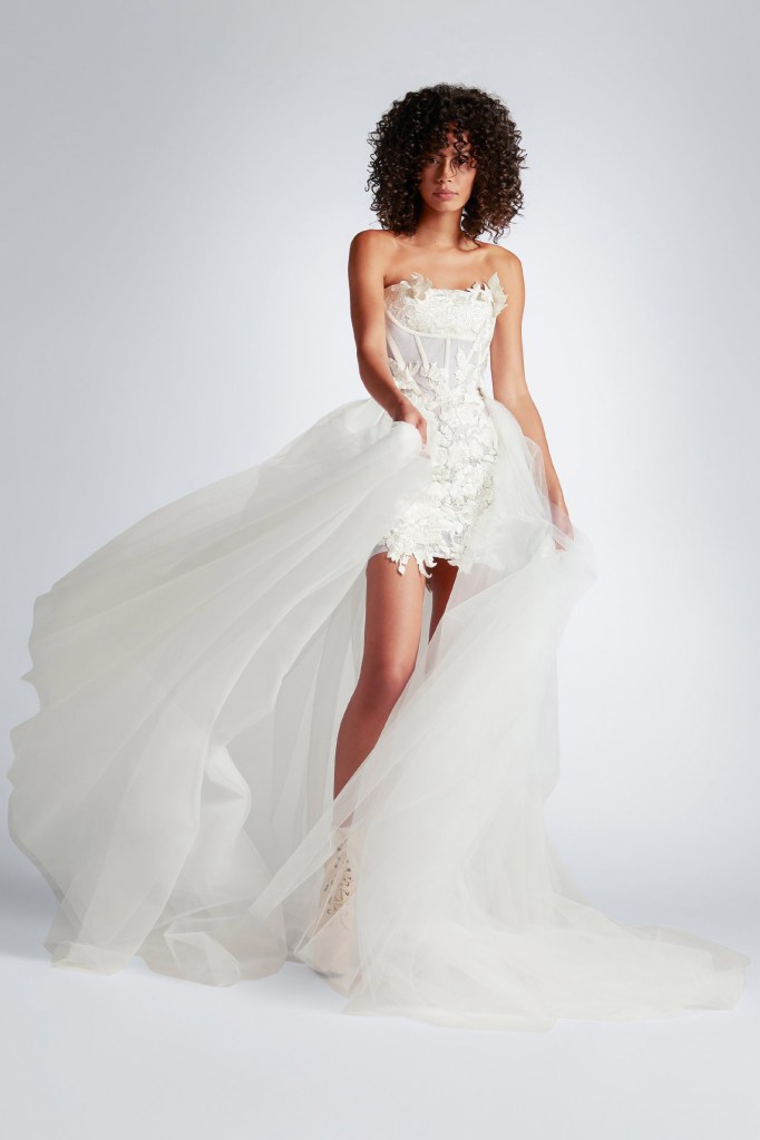 Trong khi đó, Vivienne Westwood mang đến mùa cưới 2022 một thiết kế đầy cá tính với thân váy mini dress cúp ngực corset trứ danh, nay được đính kết hoạ tiết ren hoa lá nổi 3D rất thích hợp cho mùa cưới xuân hè. Cô dâu có thể linh hoạt trong việc lựa chọn mặc tùng lưới rời cho lễ đính hôn và tháo ra để sẵn sàng cho tiệc after party ngay sau đó.