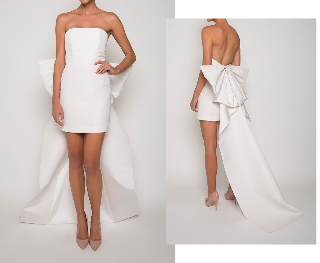 Sebastien Luke mang đến cho các cô dâu mẫu đầm cưới cocktail phong cách minimalist với điểm nhấn đặc sắc là phần lưng đính những chiếc nơ vô cùng xinh xắn, phối cùng tà váy rời tăng thêm sự nổi bật cho cô dâu trong ngày trọng đại.