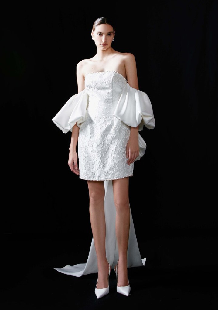 Những năm gần đây, xu hướng áo cưới tay phồng đã trở thành một trong những gợi ý được yêu thích nhất của mọi cô dâu. Nhà mốt Sebastien Luke đã mang đến cho các cô dâu 2022 một thiết kế mãn nhãn với thân váy mini dress ren viền ngọc trai sang trọng, kết hợp cùng phụ kiện tay áo phồng trễ vai và đuôi nơ oversize dài quét đất.