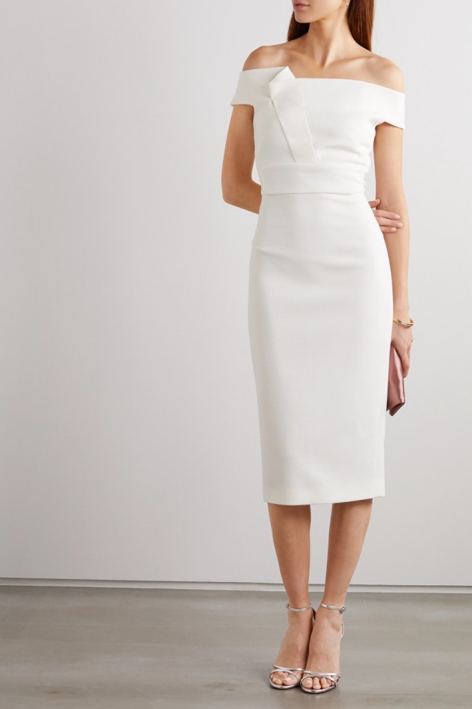 Mẫu đầm cưới cocktail của thương hiệu Roland Mouret giản dị nhưng tạo dấu ấn riêng với chi tiết trễ vai lệch cá tính, đây là một thiết kế thích hợp cho những buổi tiệc ấm cúng và thân mật.