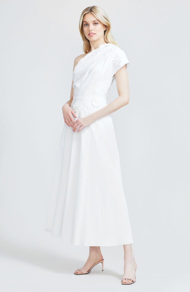 Chỉ với một chút xíu phá cách ở phần vai, xu hướng váy cưới lệch vai sẽ giúp bạn toả sáng đầy tinh tế trong mùa cưới 2022. Mẫu váy cưới đến từ nhà mốt Lela Rose mang đến cho cô dâu nét thanh lịch với những bông hoa ren 3D sinh động rải bất đối xứng trên vạt áo lệch vai.
