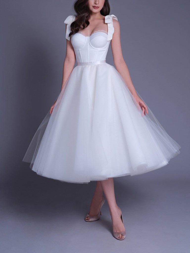 Mùa cưới 2022, những mẫu váy cưới tea-length có chiều hướng giản đơn và tiện dụng hơn, nổi bật với các chi tiết trang trí điệu đà đắt giá. Chiếc áo cưới 2 dây đến từ thương hiệu Sachin & Babi được đính kết những viên đá pha lê nhỏ nhắn ở ngực tạo nên điểm nhấn hiện đại cho thiết kế đầy thanh lịch.