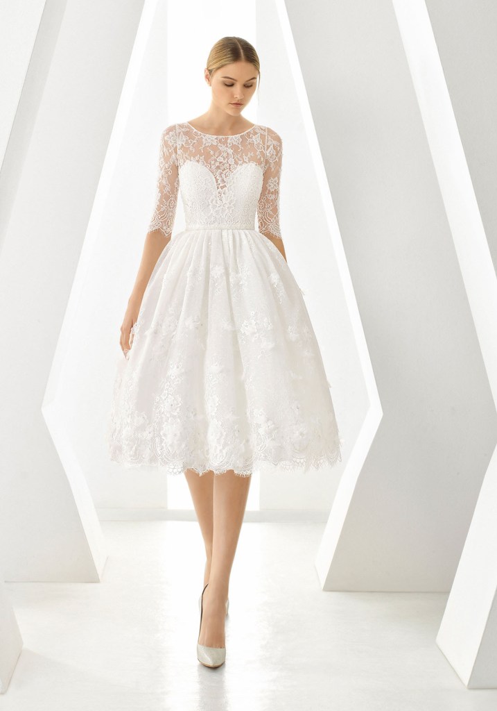 Với những cô dâu yêu thích vẻ đẹp nữ tính, váy cưới ngắn thêu ren sẽ khiến bạn khó lòng chối từ ngay phút giây đầu. Mẫu váy cưới Rosa Clara mang đến sự nữ tính chuẩn mực trên phom váy xoè nhẹ nhàng, tay áo lỡ thoải mái được phủ kín bởi ren thêu hảo hạng điểm hoa 3D xinh xắn.