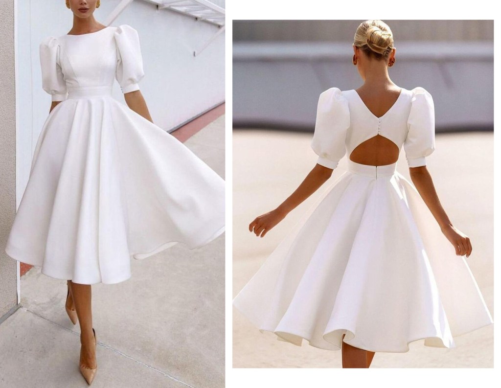 Với những cô nàng tiểu thư sang chảnh, một chiếc váy cưới midi dress tùng xoè nhẹ nhàng, kín đáo thân trước với những đường cut-out đặc sắc sau lưng, kết hợp cùng tay áo phồng điệu đà sẽ là lựa chọn tuyệt vời để nàng vừa làm lễ đính hôn xong là có thể tận hưởng chuyến du lịch kết hợp.