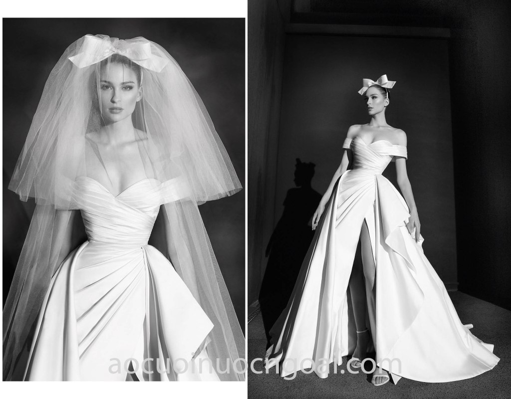 Mùa cưới xuân hè 2022, cô dâu ưa chuộng phong cách minimalist sẽ có cho mình một lựa chọn phá cách với mẫu áo cưới tối giản Zuhair Murad. Thân áo dáng suôn thực hiện trên chất vải satin đứng phom có cổ cúp tim trễ vai gợi cảm được xếp li đầy tinh tế, trải dài từ cúp ngực xuống chân váy xẻ tà khoe chân nuột nà. Nhà mốt kết hợp thêm phụ kiện tùng váy tháo rời xếp bèo tầng tạo điểm nhấn ấn tượng. Đồng thời phối với phụ kiện lúp cưới ngắn đeo nơ to bản xinh xắn trên lầu.