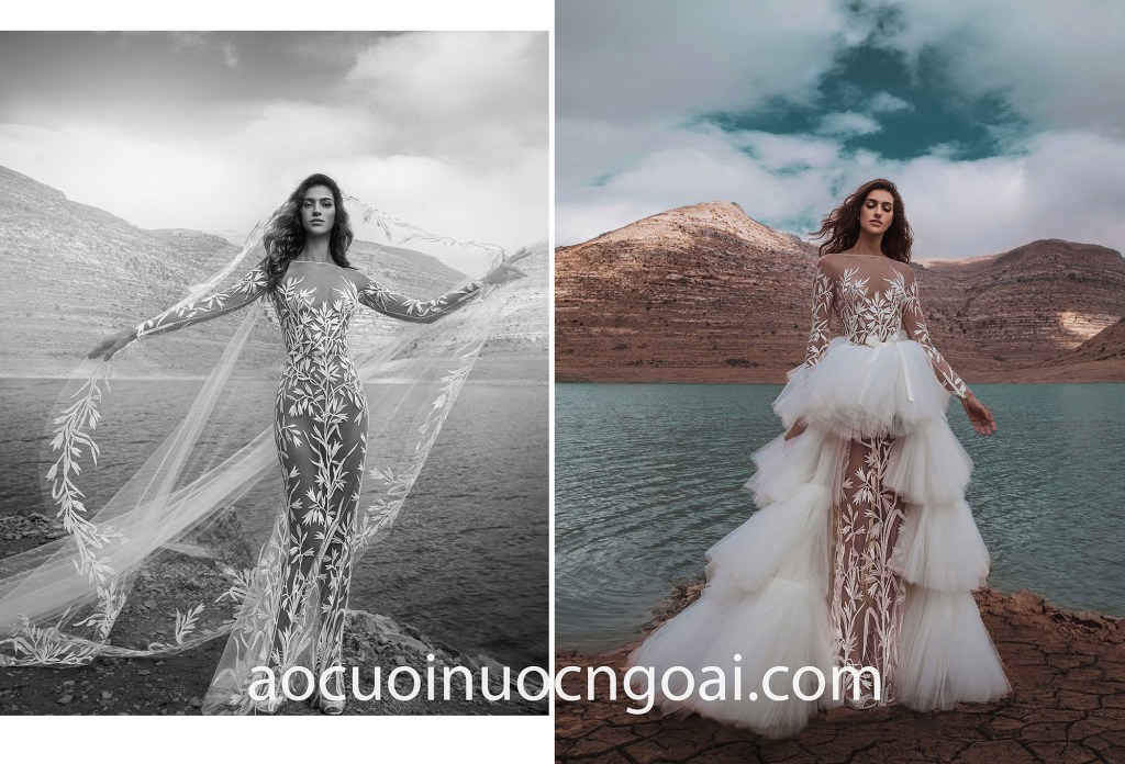 Với những cô dâu có thân hình tuyệt mỹ, mẫu áo cưới xuyên thấu Zuhair Murad sẽ giúp bạn phô diễn trọn vẹn vóc dáng nữ thần với thiết kế trong suốt hoàn toàn, kết hợp hoạ tiết ren thêu uốn lượn theo từng centimet cơ thể. Tùng váy lưới bèo tầng có thể tháo rời góp phần tạo điểm nhấn ấn tượng và tăng độ kín đáo cho bộ trang phục có phần táo bạo.